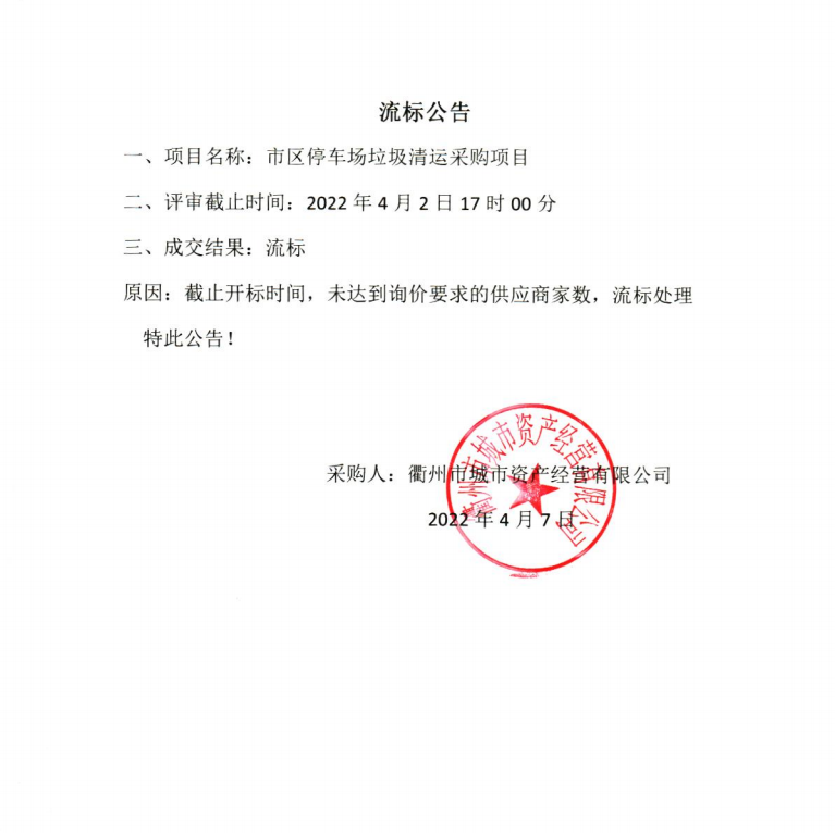 市區(qū)停車場(chǎng)垃圾清運(yùn)采購項(xiàng)目流標(biāo)公告