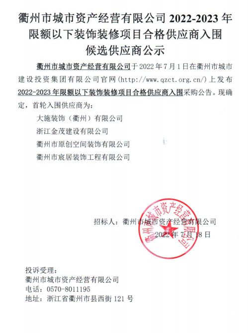 衢州市城市資產(chǎn)經(jīng)營有限公司2022-2023年限額以下裝飾裝修項(xiàng)目合格供應(yīng)商入圍 候選供應(yīng)商公示