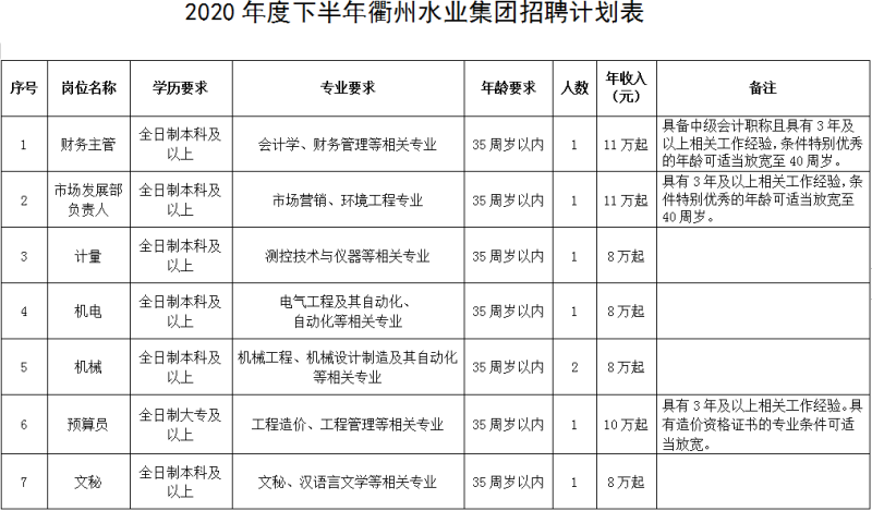1.2020年度下半年衢州水業(yè)集團招聘計劃表