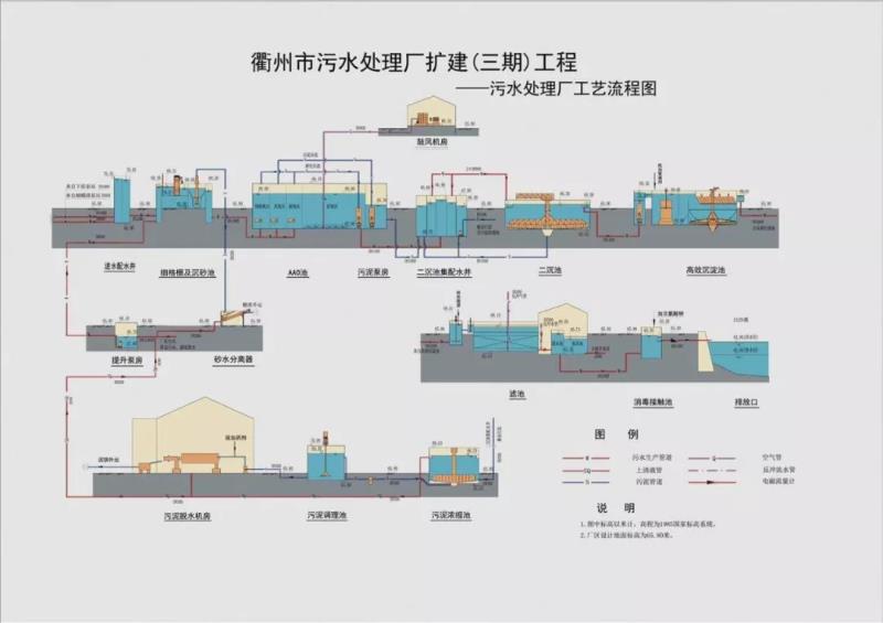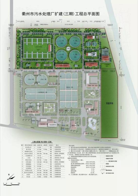 三期建設(shè)內(nèi)容包括建設(shè)提升泵房一座、細(xì)格柵和沉沙池一座、進(jìn)水配水井一座、AAO及污泥泵房一座、二沉池四座(含為一期預(yù)留的兩座)、高效沉淀池一座、深床反硝化濾池一座、消毒接觸池一座、污泥濃縮池兩座、污泥調(diào)理池一座、加藥間一座污泥脫水機(jī)房一座、鼓風(fēng)機(jī)房及配電間一座等。