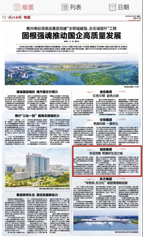 9月18日,浙江日?qǐng)?bào)12版專版刊登了題為《衢州高標(biāo)準(zhǔn)推進(jìn)基層黨建“全領(lǐng)域建強(qiáng)、全區(qū)域提升”工程 固根強(qiáng)魂推動(dòng)國企高質(zhì)量發(fā)展》一文,點(diǎn)贊衢州以高質(zhì)量黨建引領(lǐng)國有企業(yè)高質(zhì)量發(fā)展。其中,還報(bào)道了城投集團(tuán)在黨建引領(lǐng)下,企業(yè)建設(shè)不斷走向“高質(zhì)量”。