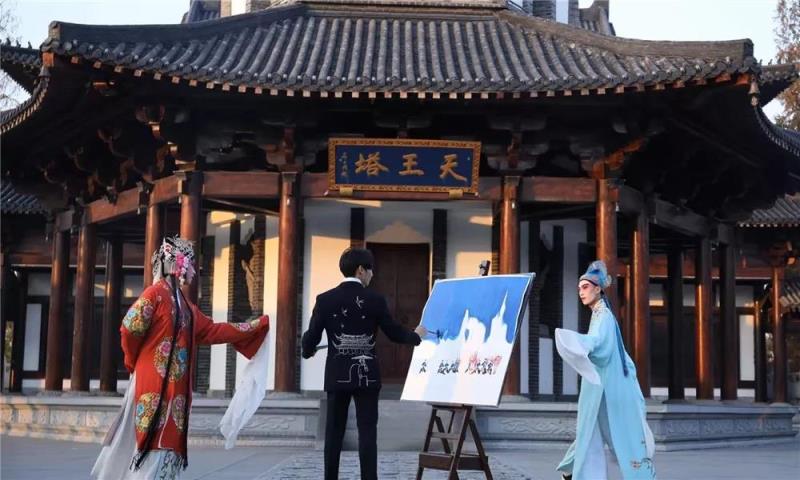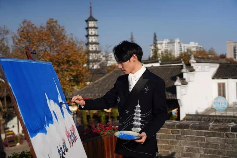 視頻中,何平身著有天王塔元素的西服,并置身在天王塔下邊觀摩婺劇表演者的表演,邊用畫筆一筆一畫畫出婺劇演員最精髓的表情和動(dòng)作,并和澳門的景色結(jié)合在一起,別有一番韻味。