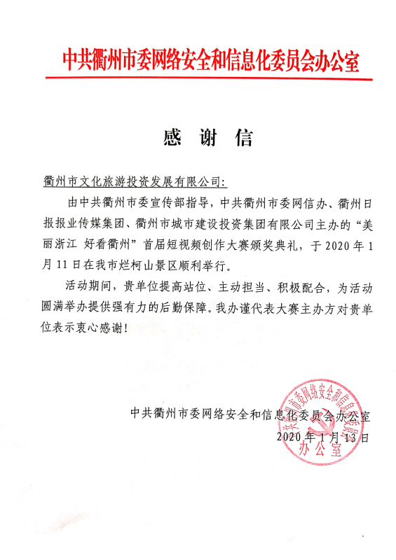 中共衢州市委網(wǎng)絡(luò)安全和信息化委員會(huì)辦公室向文旅投公司發(fā)來(lái)感謝信