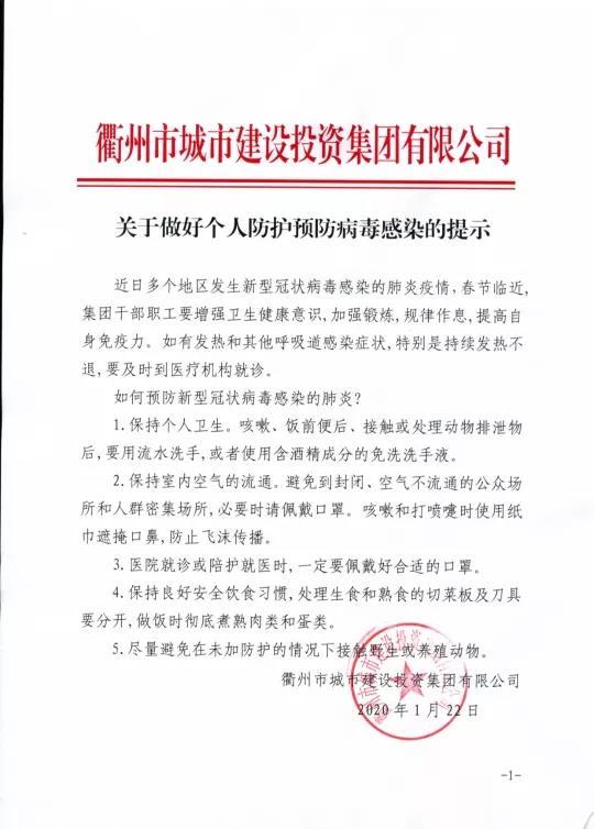 1月22日,市城投集團通知要求街區(qū)、景區(qū)、項目工地等做好新型冠狀病毒肺炎疫情防控工作。