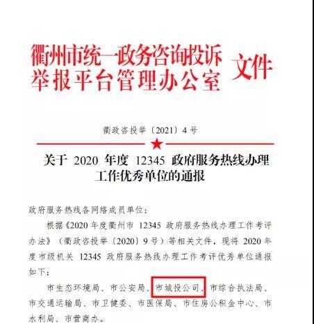 近日,衢州市統(tǒng)一政務(wù)咨詢投訴舉報平臺管理辦公室發(fā)布《關(guān)于2020年度12345政府服務(wù)熱線辦理工作優(yōu)秀單位的通報》,市城投集團榮獲“2020年度12345政府服務(wù)熱線辦理工作優(yōu)秀單位”。